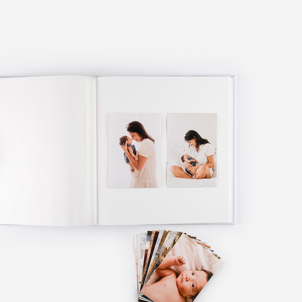 Álbum de cartão resistente, com folhas em branco.